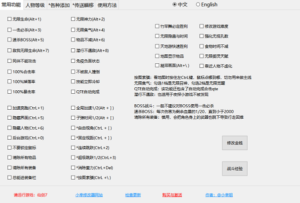 仙剑奇侠传7多功能修改器小幸版,这是由小幸大神专为此游戏制作的一款游戏辅助工具。该修改器版本为绿色版本,使用起来极为的便捷,玩家只需要在本站下载安装,然后打开游戏再开修改器即可使用,并且它还能够为玩家们提供许多修改功能,支持常用功能、人物等级、各种添加、等多种多样的修改功能,全方位满足玩家的游戏需求,大幅度减小游戏的难度。同时仙剑奇侠传7多功能修改器还支持中文、英文两种语言,安全无毒无广告,但为了避免丧失游戏的体验性,小编还是建议大家适当的进行修改,还在等什么,有需要的玩家快来下载使用吧!