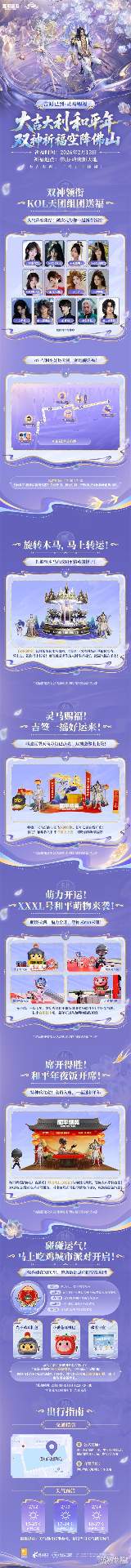 本次活动联动广东文旅、佛山文旅,打造沉浸式祈福场景。2月13日,于佛山岭南新天地举办双神祈福街区快闪活动,高颜值顶流COSER组成神装天团空降现场,由双神COSER领衔在各打卡点互动巡游,与特种兵近距离互动,还原游戏经典动作,沉浸式传递祈福氛围。