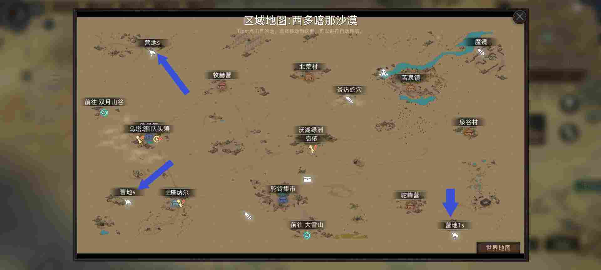 3.每个阵营地图四周大概有两到三个强盗营地,剿灭后会奖励1-2点天赋点。奖励视营地难度而定,中期的时候可以开始刷营地升级了,全部拿下。营地具体位置如图