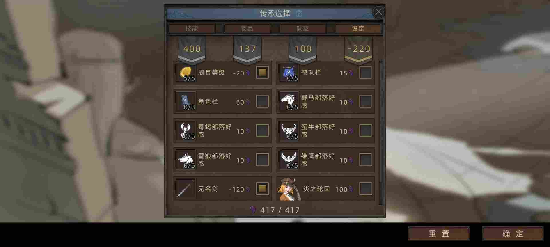 四周目沙盒模式结档目标是12座城,这里楼主多打了一座然后就不打了。打多没意义,上面已经讲过成就系统了,这里不多讲。可以看到周目结档成就是417,那么楼主五周目无名剑主开局就会有417+120+100=637成就去使用。