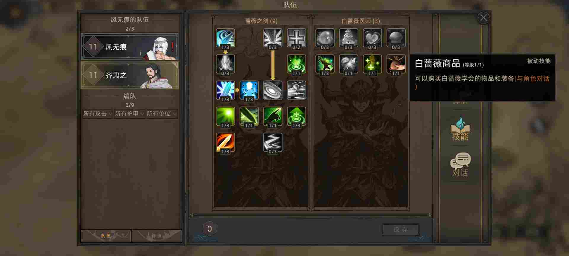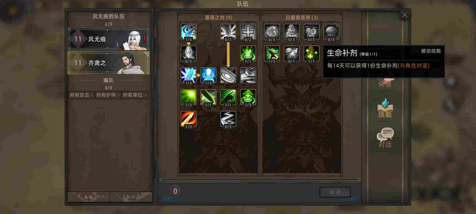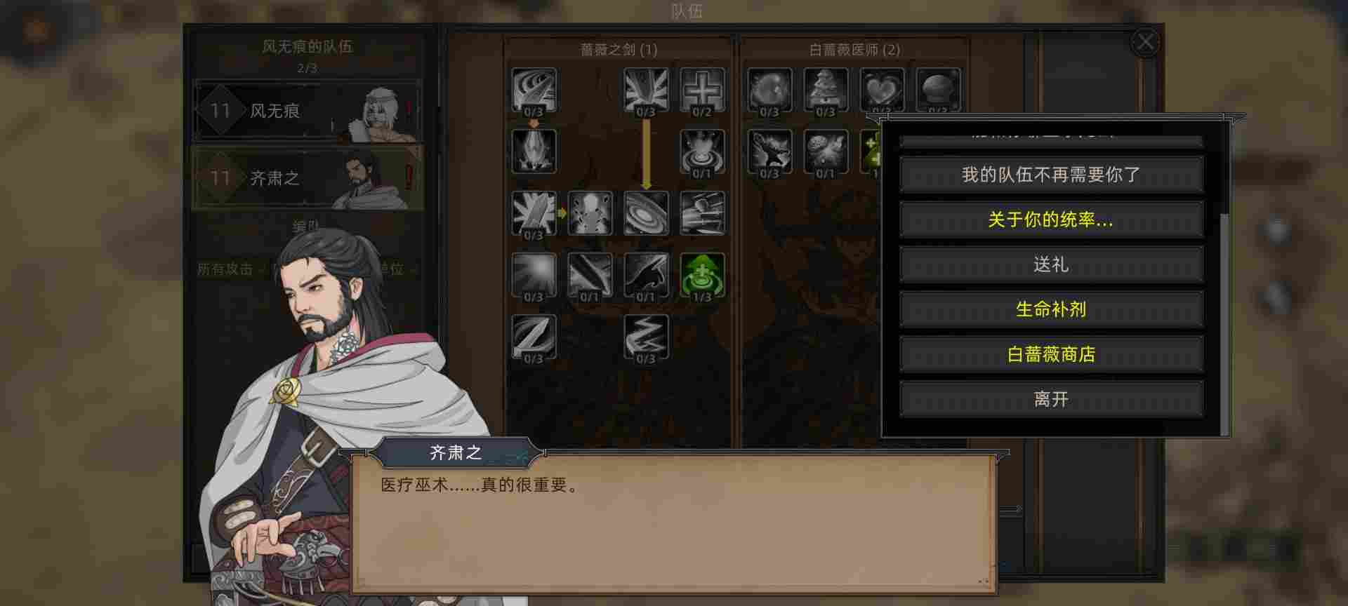这里选了齐肃之,能打能奶还能降低敌人数值,然后能治疗部队重伤。最重要的是为了14天一次对话领取生命药剂技能,食用加500生命。综合一局下来两三百天可以为主角增加6k-1w点生命值。技能商店里还有三天刷新一次加30生命上限和10气力上限的资料书购买,你值得拥有。