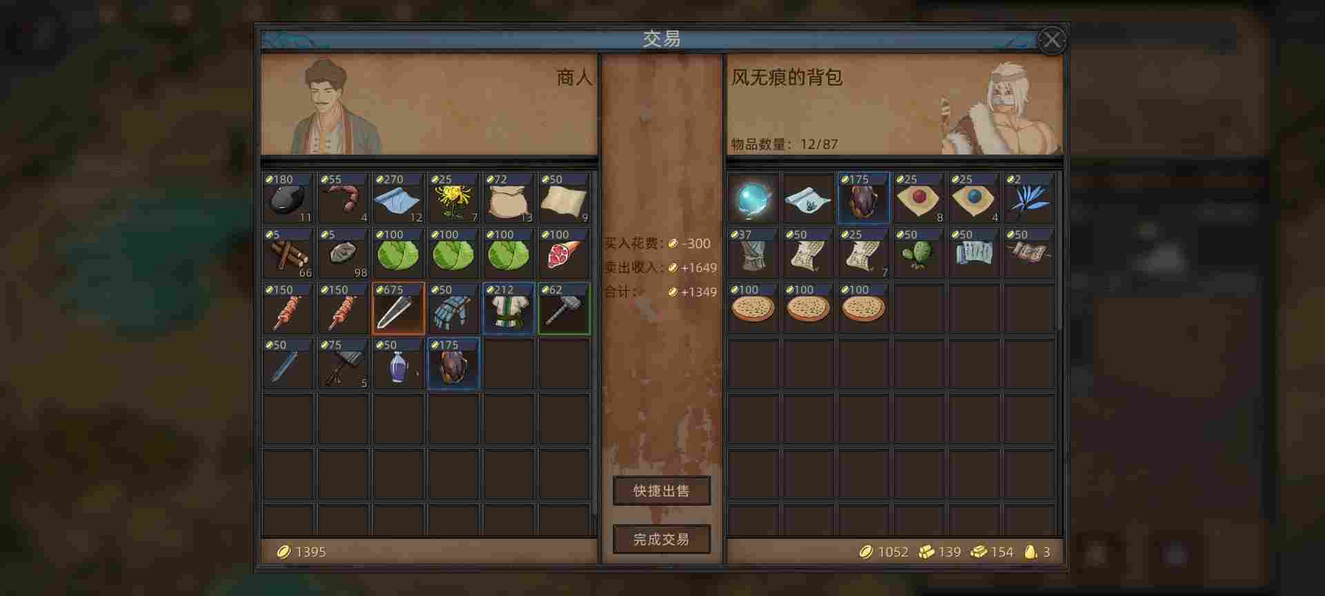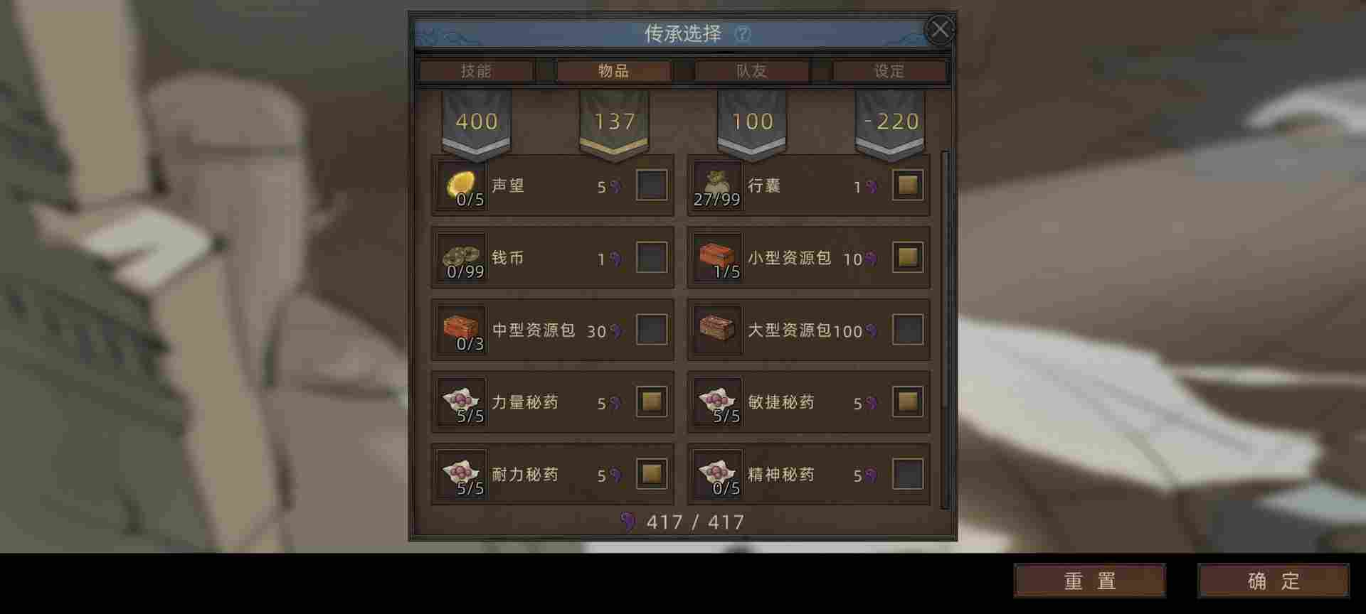 然后剩下的成就用来物品栏选择,力敏耐拉满,然后智慧结晶是加技能点的,这里楼主就选了一个,因为成就不够用了,新人可以优先拉满。这东西到中期就不缺了,结档的时候都还剩下五十多个。上面楼主点了个小形资源包。够交第一个地区保护费解除通缉状态就行,因为无名剑主开局是被所有势力通缉的。然后最后剩27点全部选择背包格子,背包在前中期效益非常大。