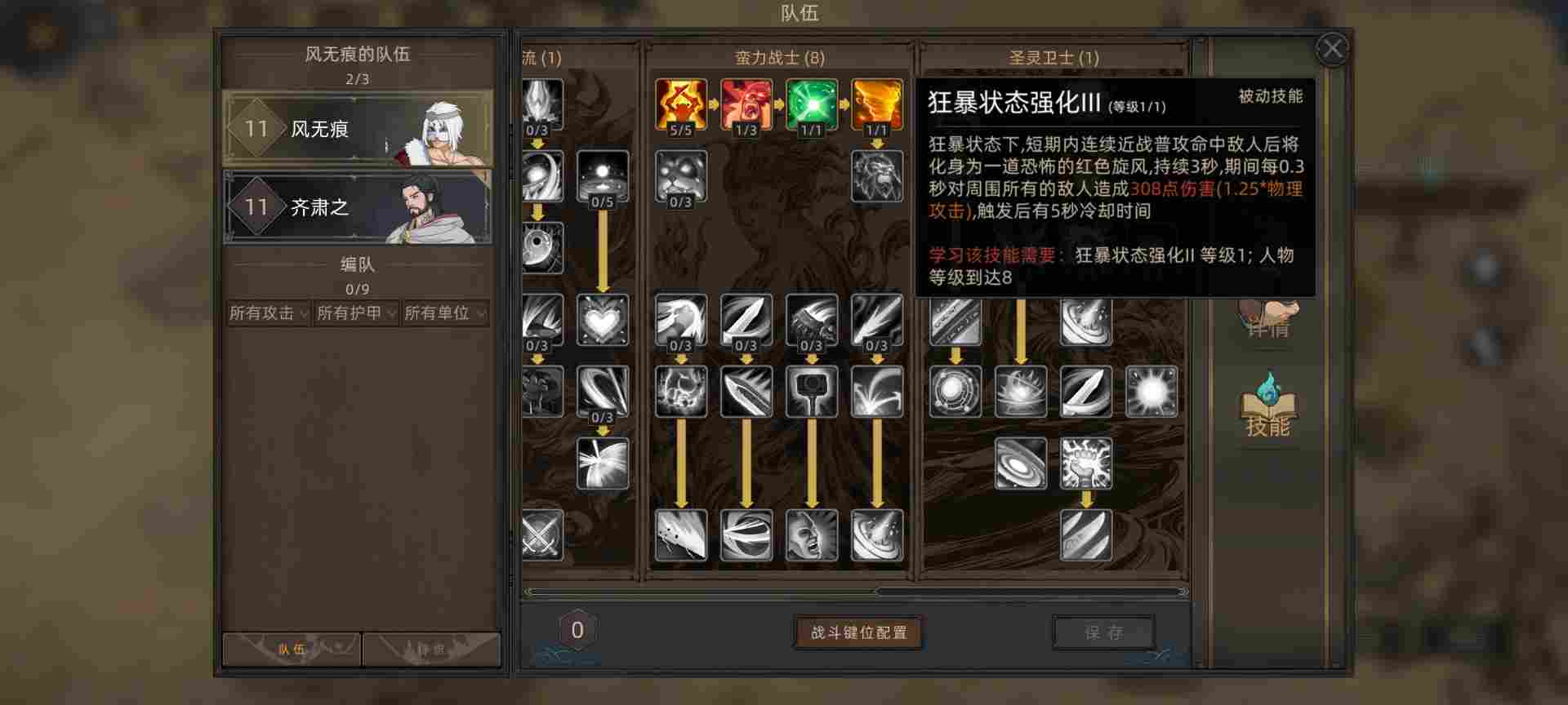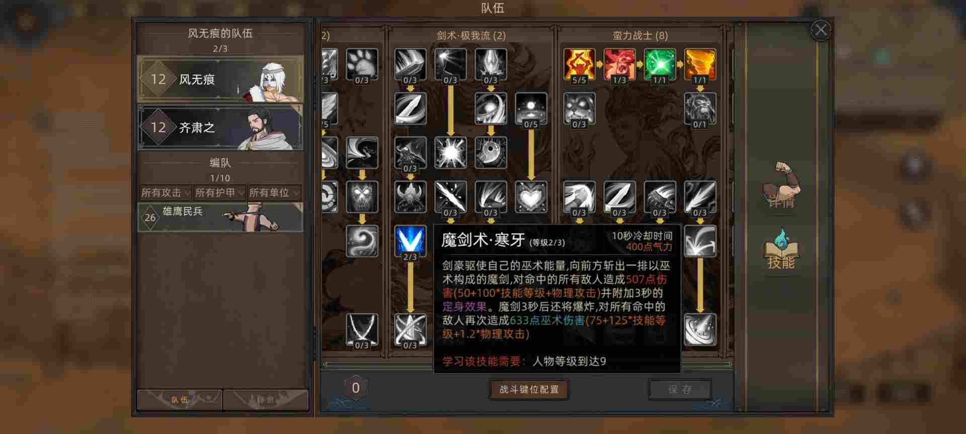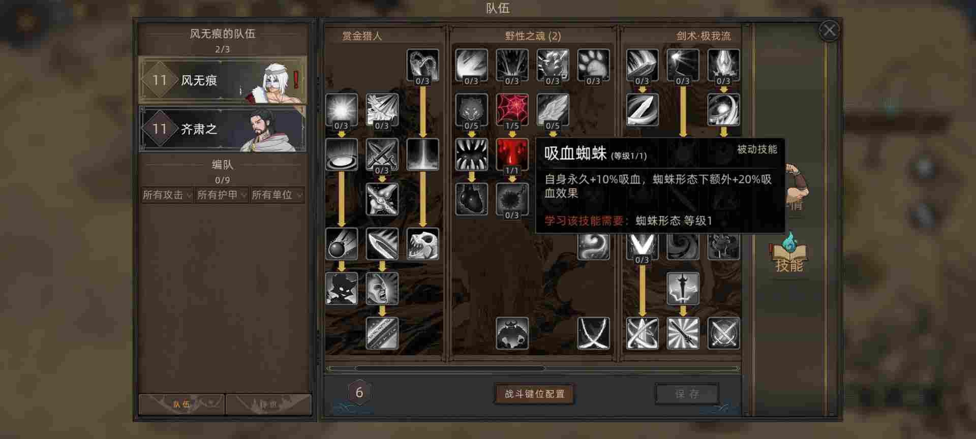 这边因为楼主是五周目难度,所以初始等级11级,游戏等级上限45级。技能点加上开局的一点结晶总共12点可以分配,这里花两点给野兽技能页,点出10%被动吸血。让我们的主角风无痕具备战斗续航能力