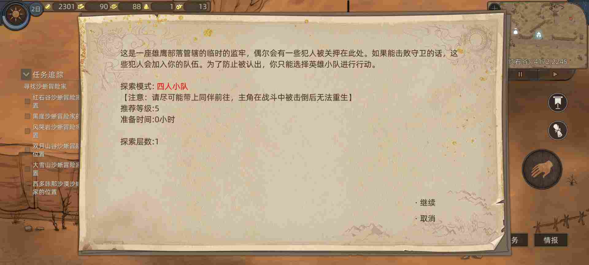 然后往右边走开启我们第一个5级小队副本,这里难度比较大,新人可能打不了可以先不打。因为我是五周目初始等级11级开局才打的过的,你们1级开局先别打这个。然后我们打过的副本最好养成在地图做标记的好习惯,这样后面你打开地图就可以轻松找到自己想刷的副本。像这种普通副本就做个难度等级的标记就行了。