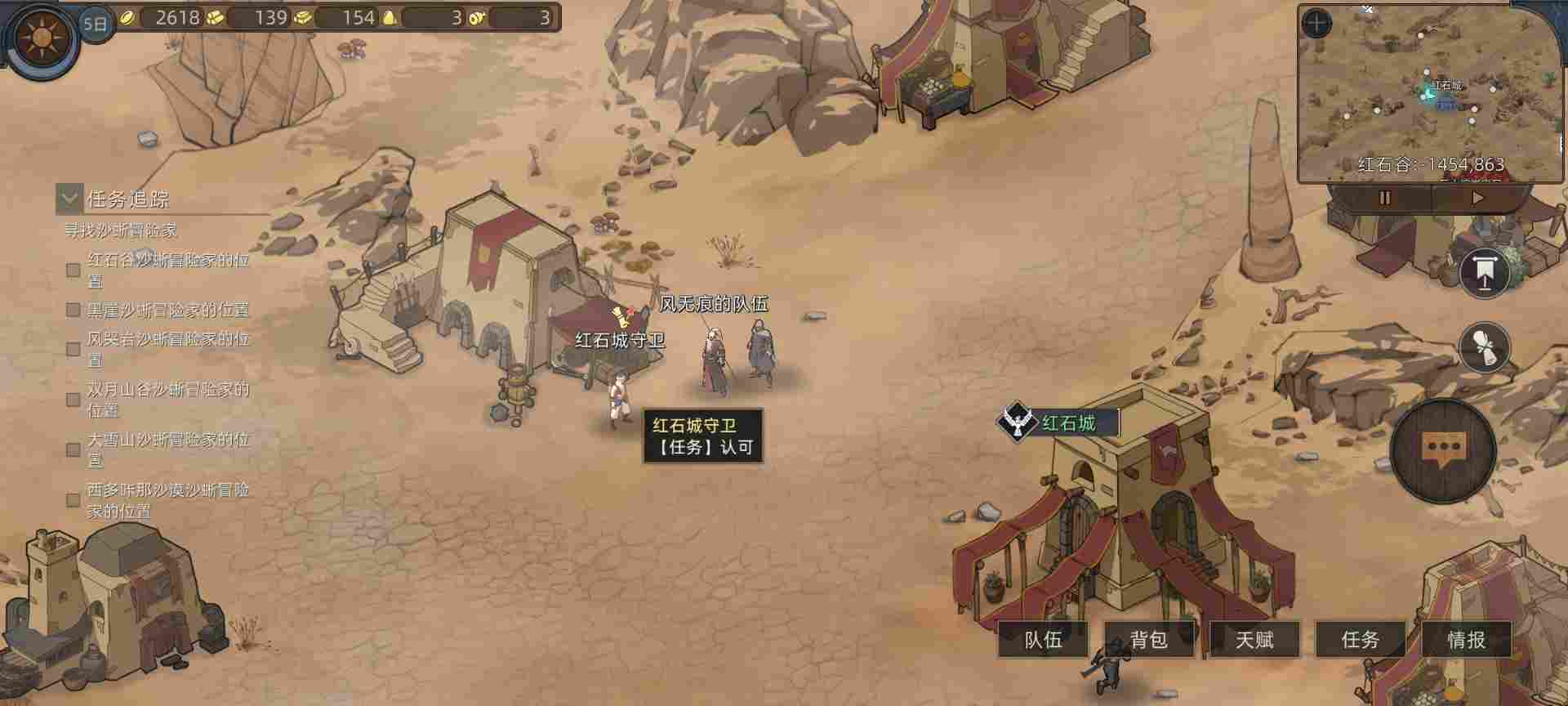 做完驿马村任务后我们接着往上走回到红石城,运气非常好随机到商队任务。这个任务最舒服,直接领取就好,不用护送商队,让它自力更生。大概率它自己能安全到达的,嘻嘻~白得奖励。