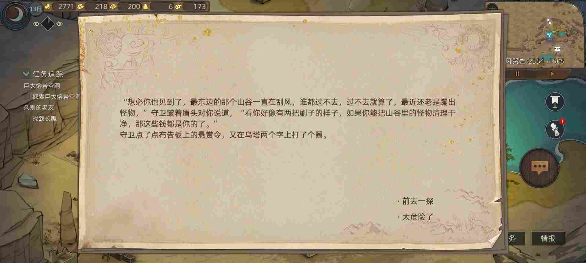 叮咚~风无痕已经正式进入风哭岩地图探索啦,这里我讲一下,记录贴萌新不用刻意照搬进度。只需要吸收一些基础知识,知道地图大概副本位置及难度,然后你们玩的时候打不过先别打,多打点野怪或者做点任务多待十几天再打都没影响的。随意玩就好,记住前期以刷经验升级为主。